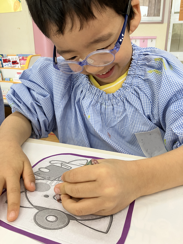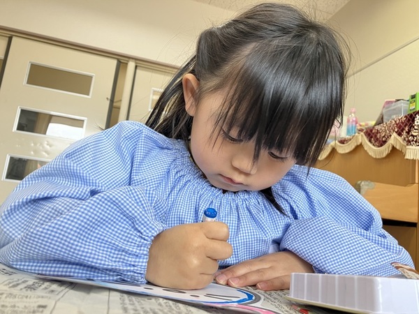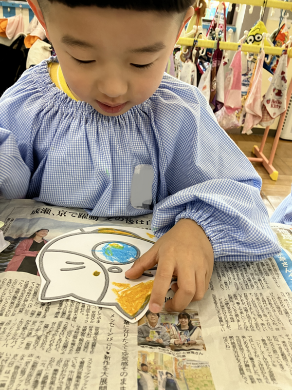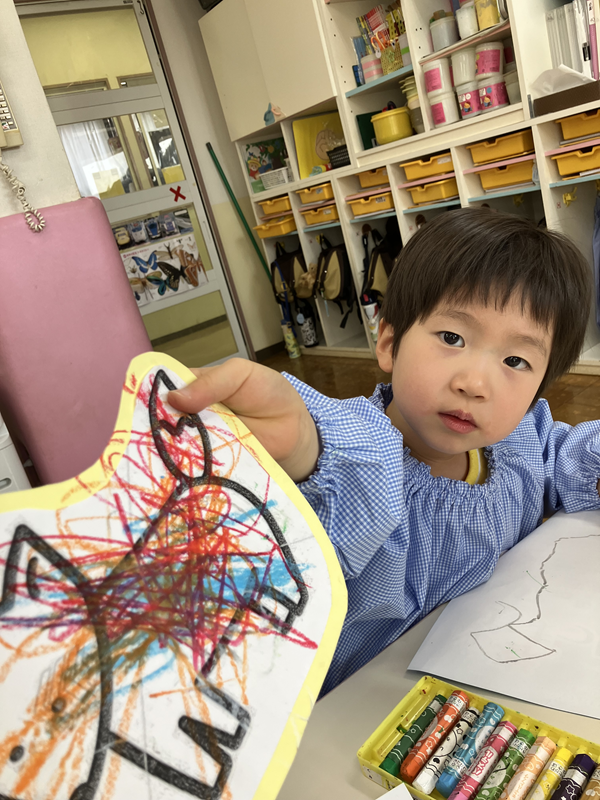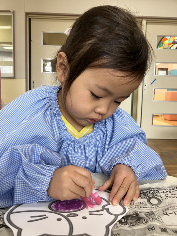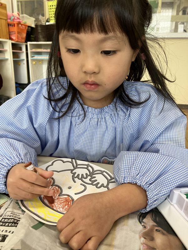クレパスで思いおもいに色を塗り、ぬりえをして