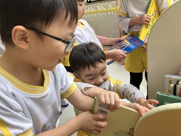廊下、絵本棚