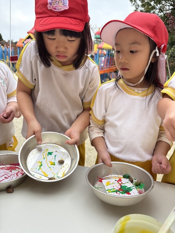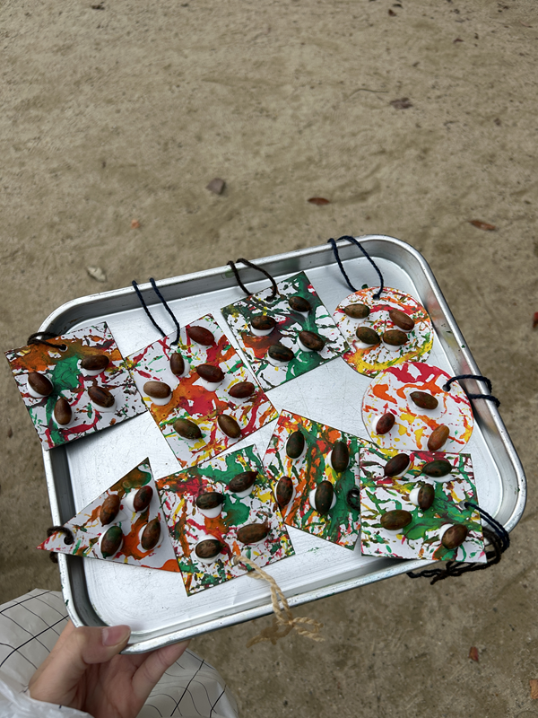 どんぐりも集めて好きな絵具をつけて