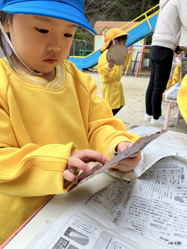 葉っぱを拾いちぎってトイレットペーパーの芯に