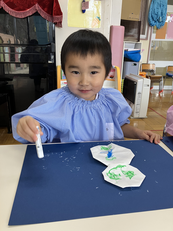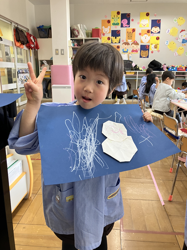 のりで貼り、紺色の色画用紙に白色のクレパスでたくさんの雪を描いて