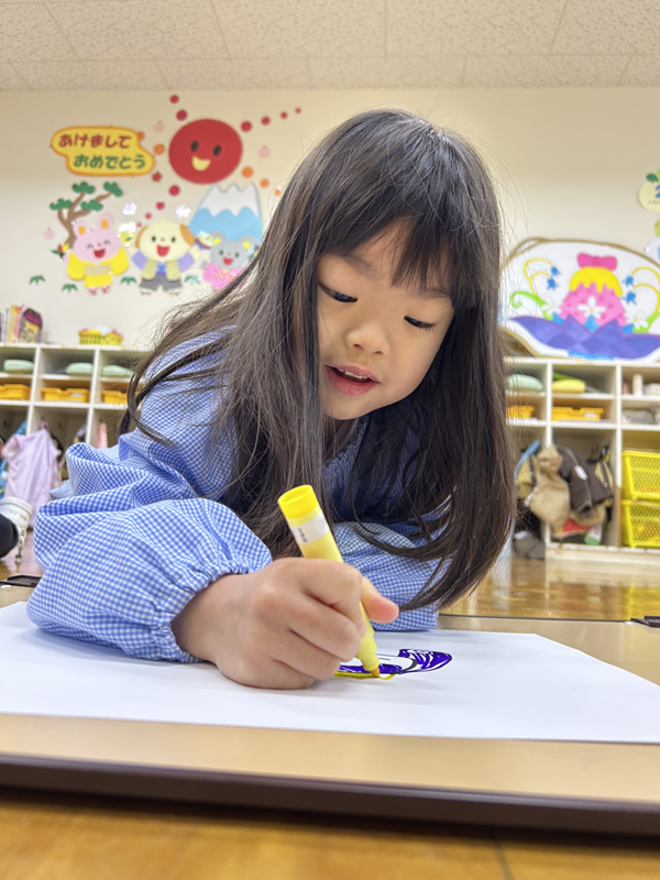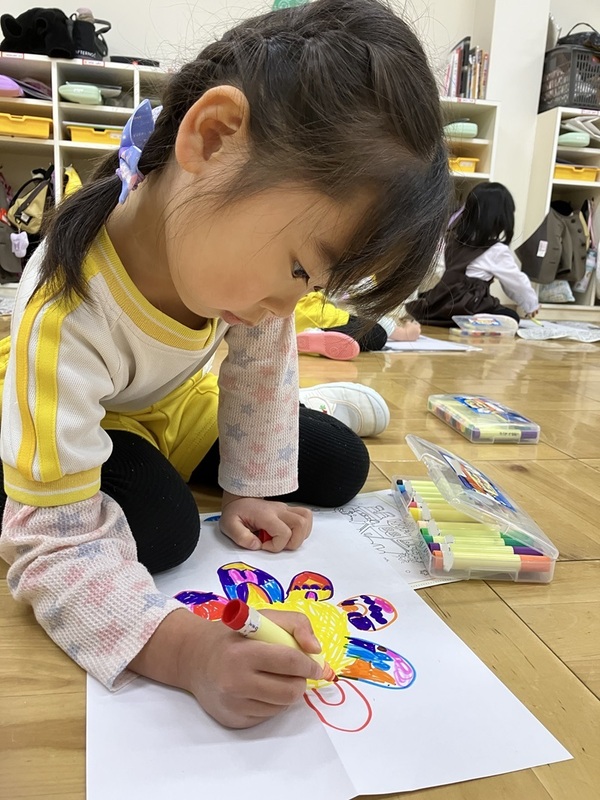 クレパスで思いおもいに色を塗り、ぬりえをして