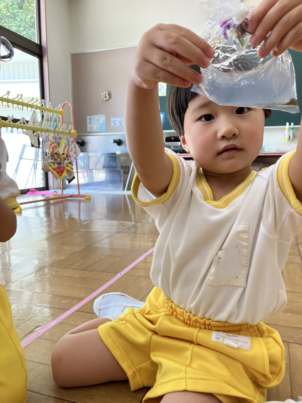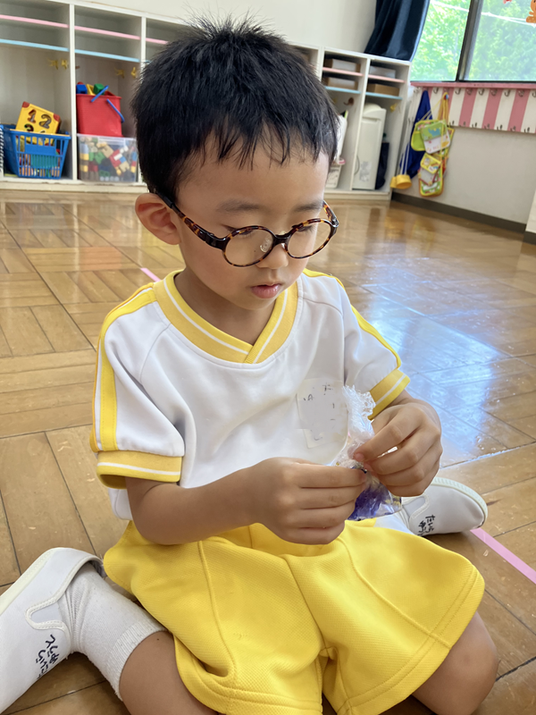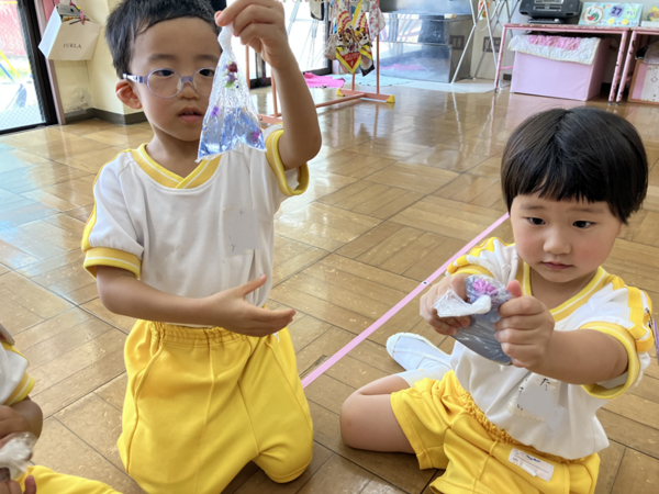 お友だちにお泊り保育で着ていた服の模様を聞いたり、