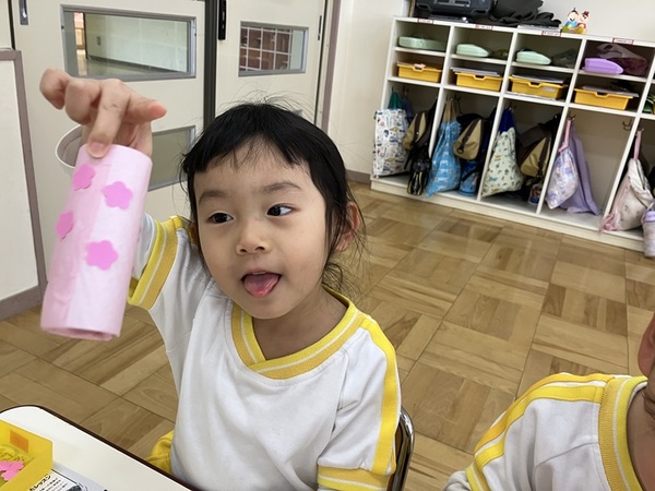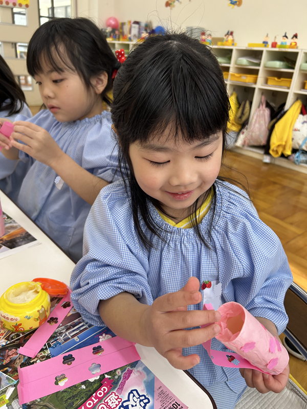 花紙を巻いて桃のお花をペタペタ♪